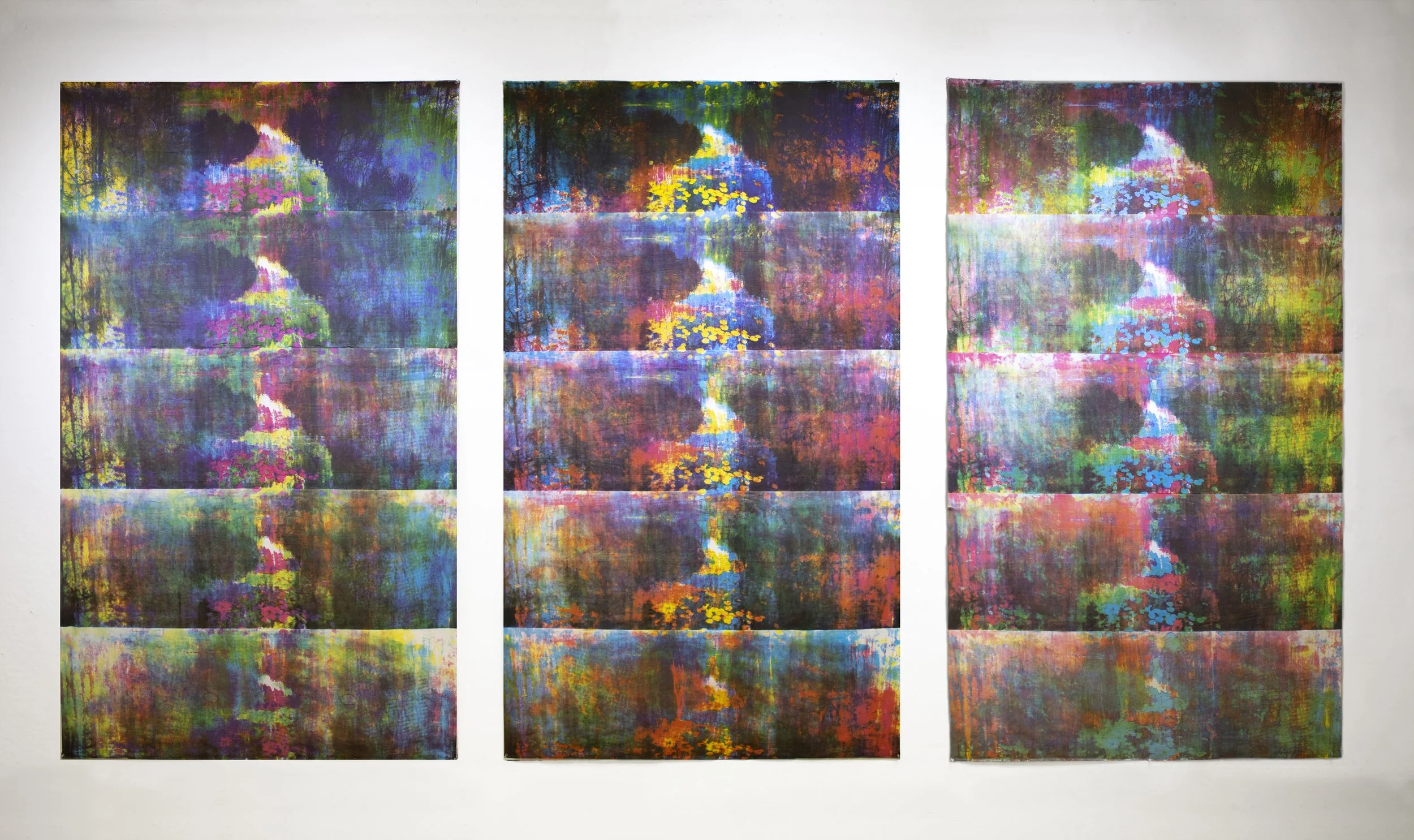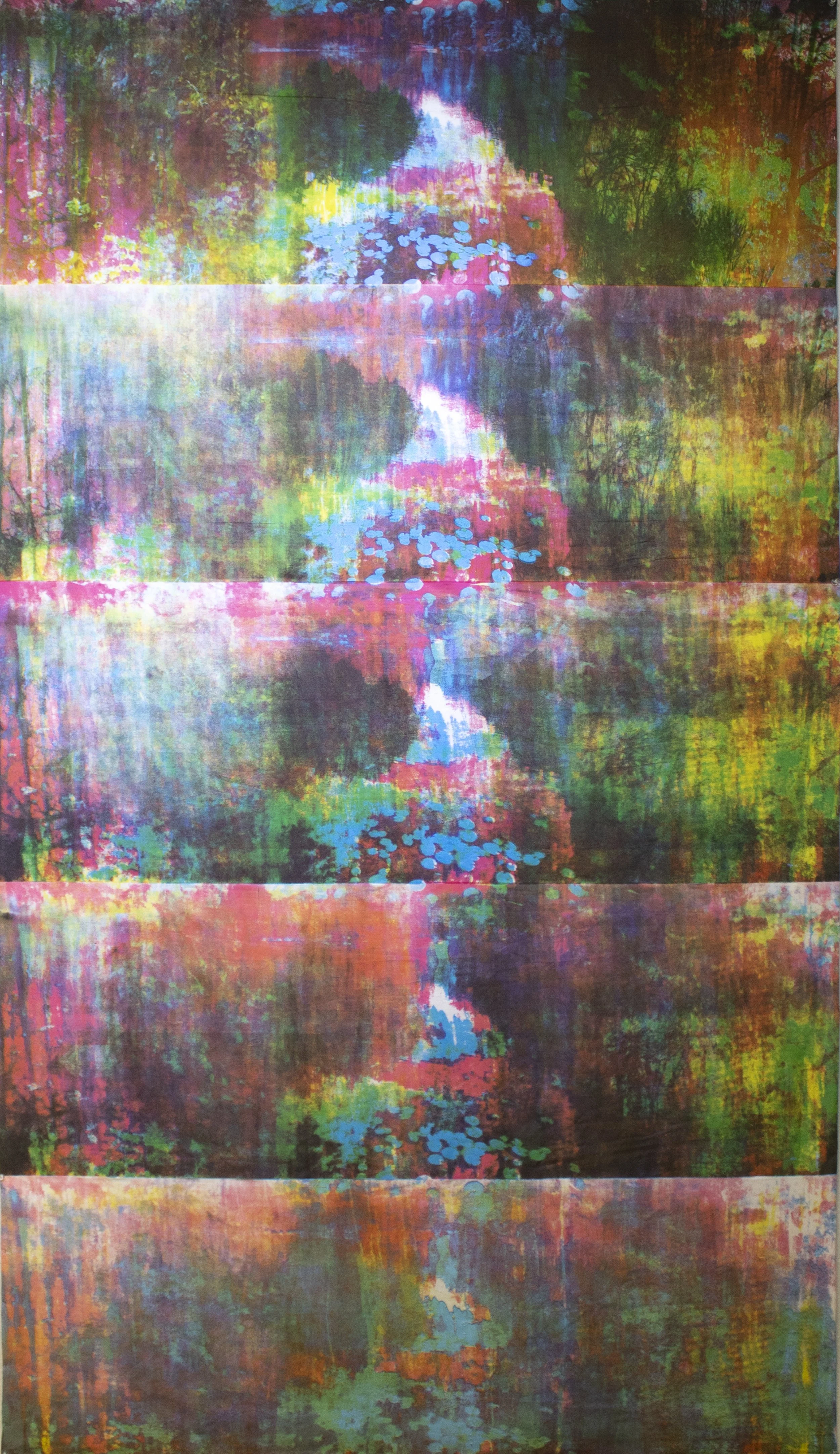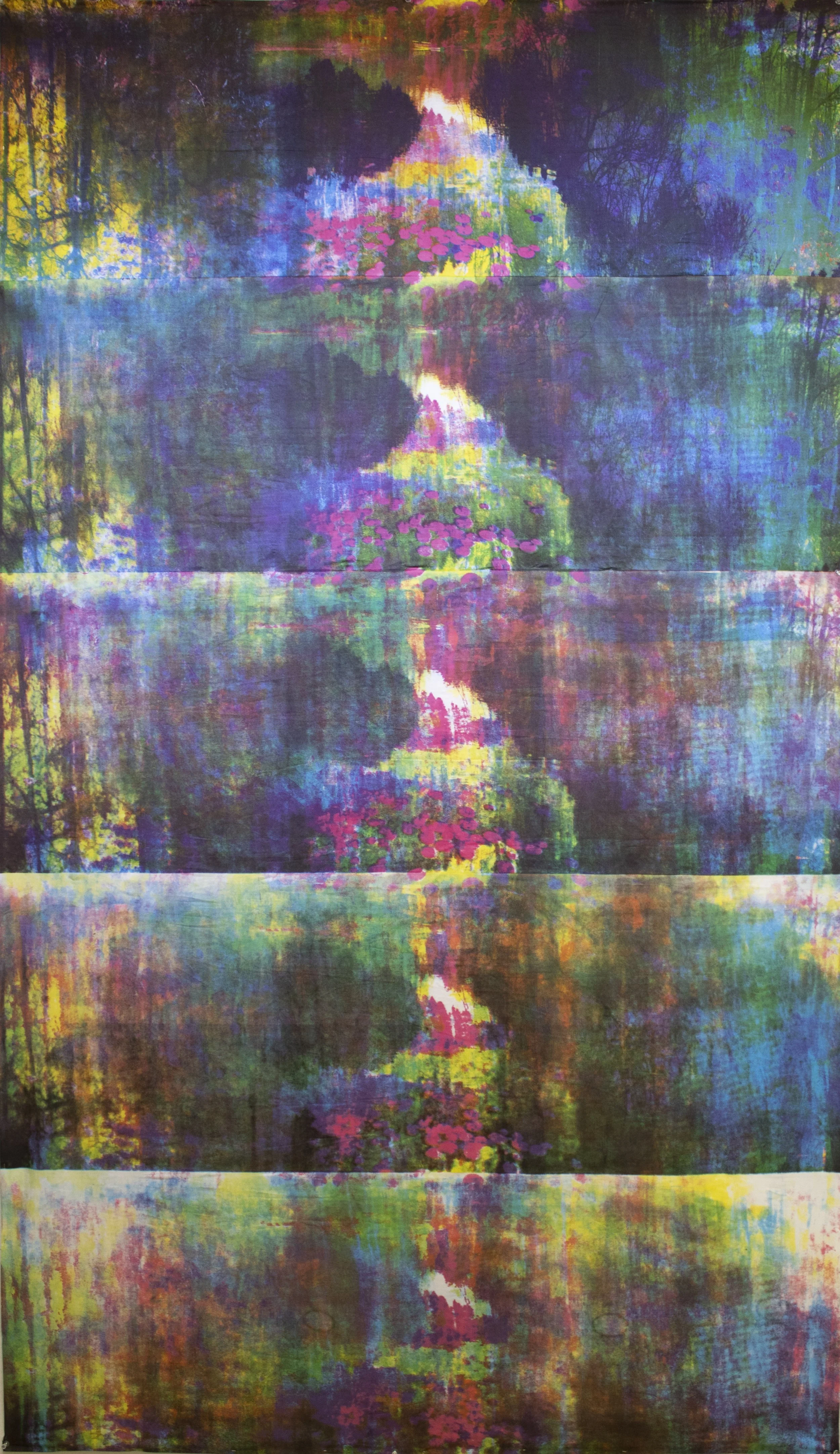 This work began by screen printing a single image collage and scanning it. The new scanned image was then screen printed beneath it. This process was repeated until the work devolved into nothing more than hazy color fields and moire patterns.